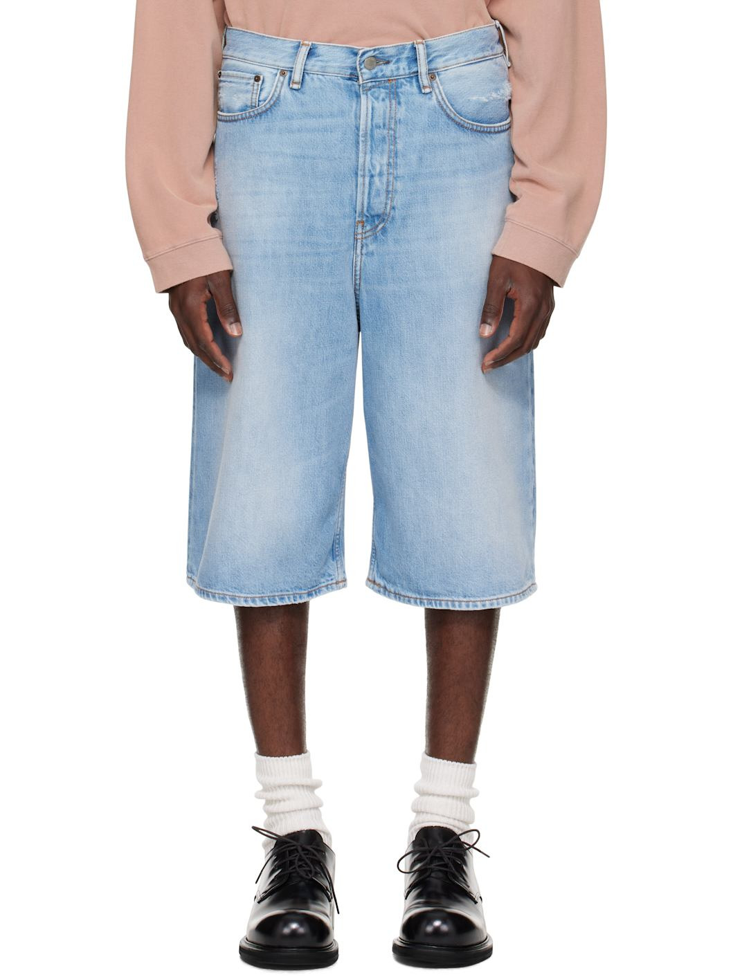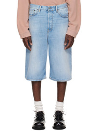 Non-stretch organic cotton denim shorts. · Fading, whiskering, and distressing throughout · Straight-leg · Low-to-mid-rise · Belt loops · Five-pocket styling · Button fly · Leather logo patch at back waistband · Contrast stitching in tan Supplier color: Light blue 100% organic cotton. Made in Italy 252129M193004