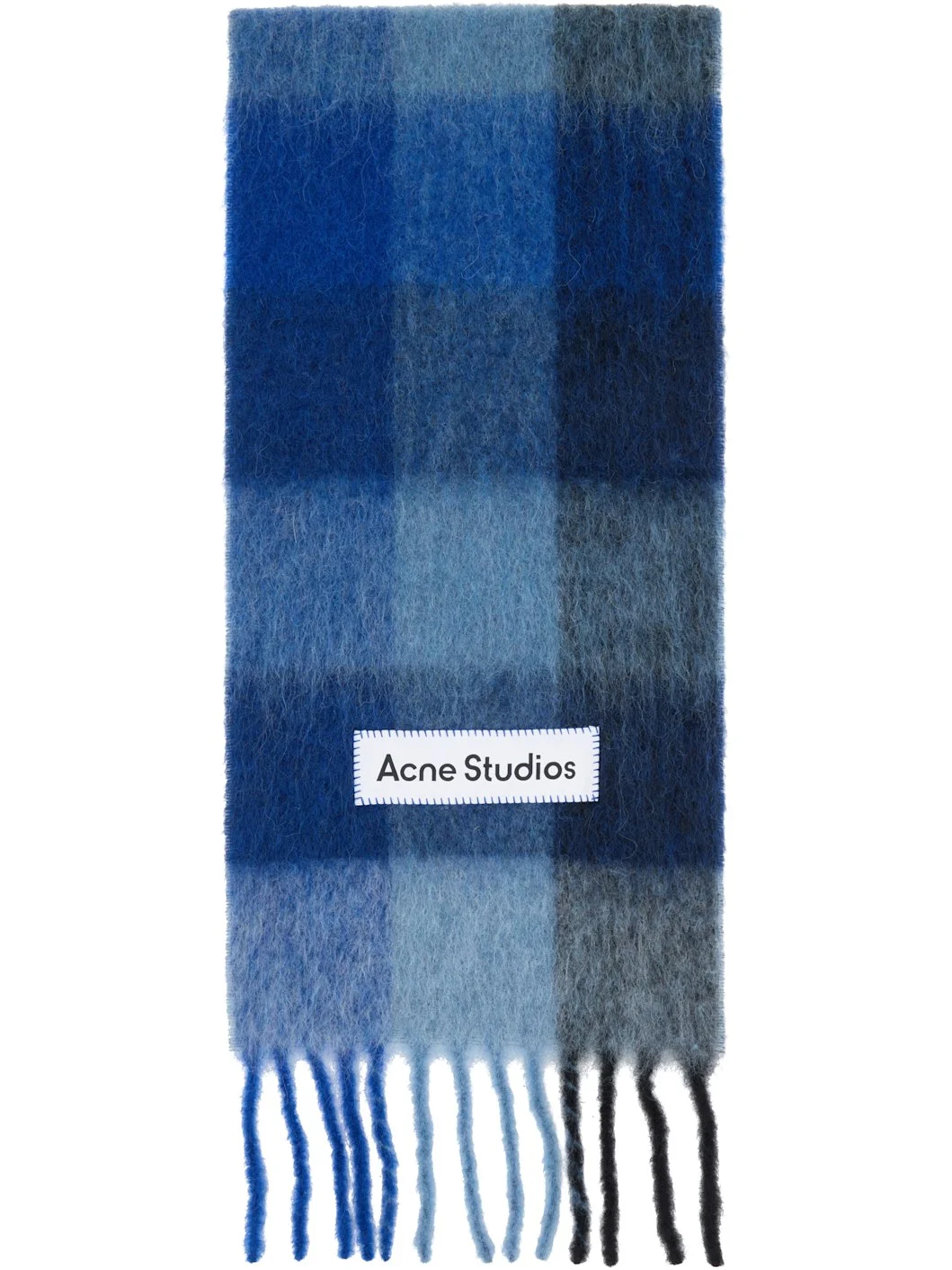 Rectangular brushed alpaca- and wool-blend flannel scarf. · Check pattern throughout · Logo patch at face · Fringed detailing at ends · L108" x W11" Supplier color: Dark Navy/Black/Blue 33% alpaca, 25% wool, 22% nylon, 20% mohair. Made in Italy 252129F028040