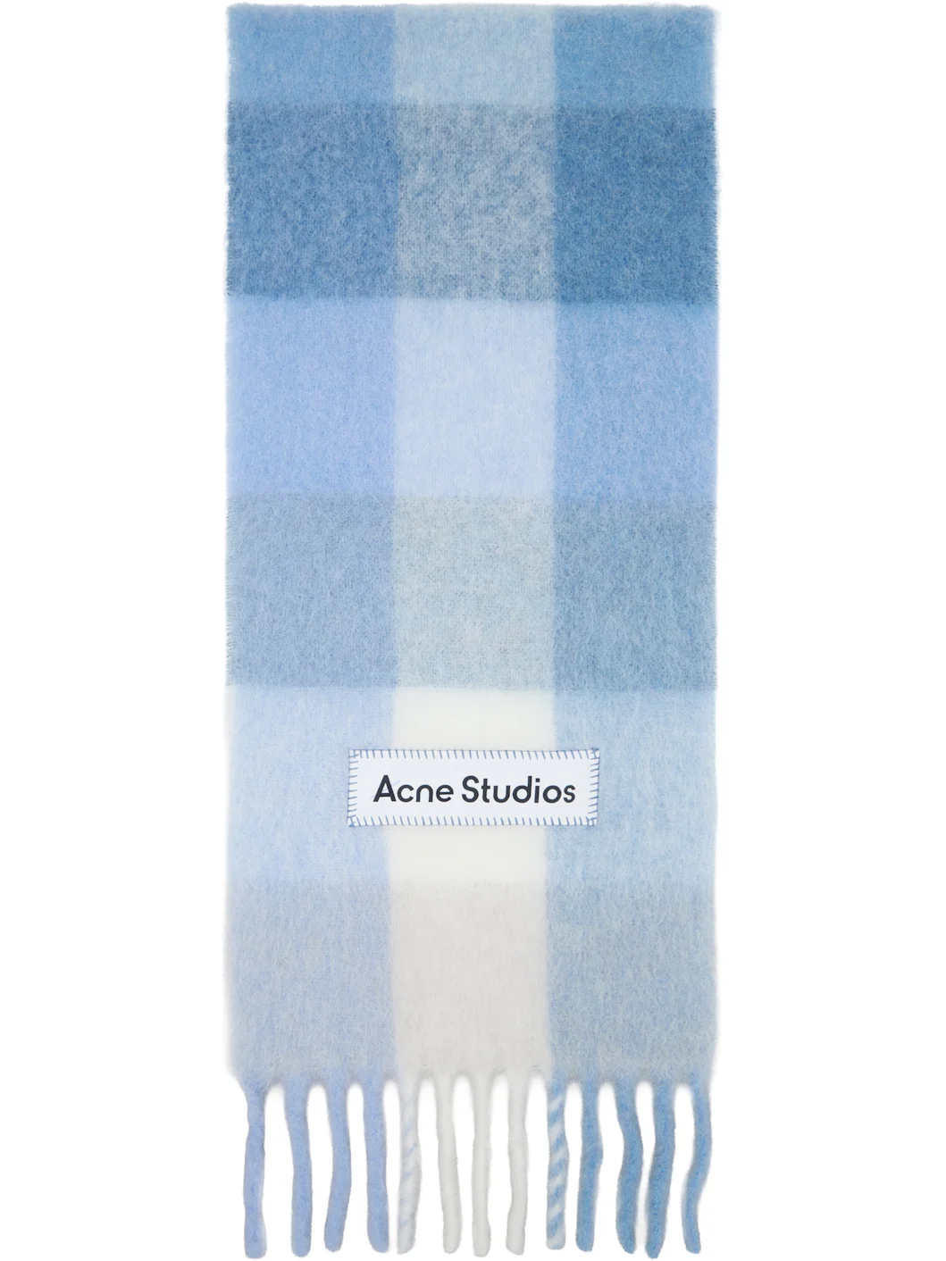 Rectangular brushed alpaca- and wool-blend flannel scarf. · Check pattern throughout · Logo patch at face · Fringed detailing at ends · L90" x W11" Supplier color: Light blue/White/Powder blue 33% alpaca, 25% wool, 22% nylon, 20% mohair. Made in Italy 261129F028036