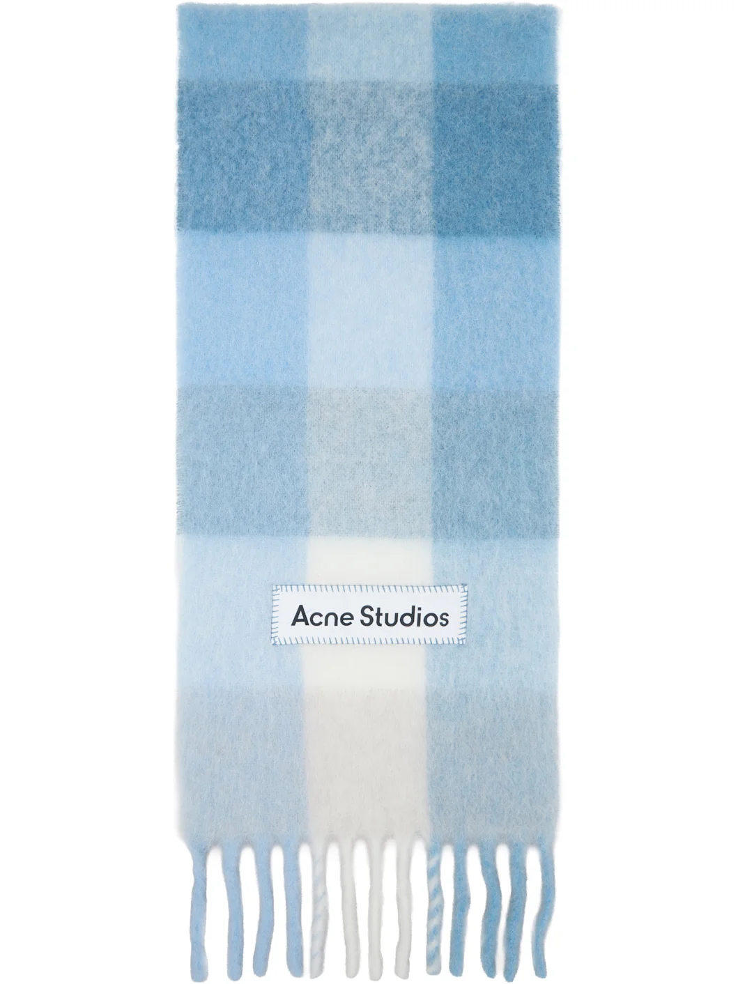 Rectangular brushed alpaca- and wool-blend flannel scarf. · Check pattern throughout · Logo patch at face · Fringed detailing at ends · L90" x W11" Supplier color: Light blue/White/Powder blue 33% alpaca, 25% wool, 22% nylon, 20% mohair. Made in Italy 261129M150037