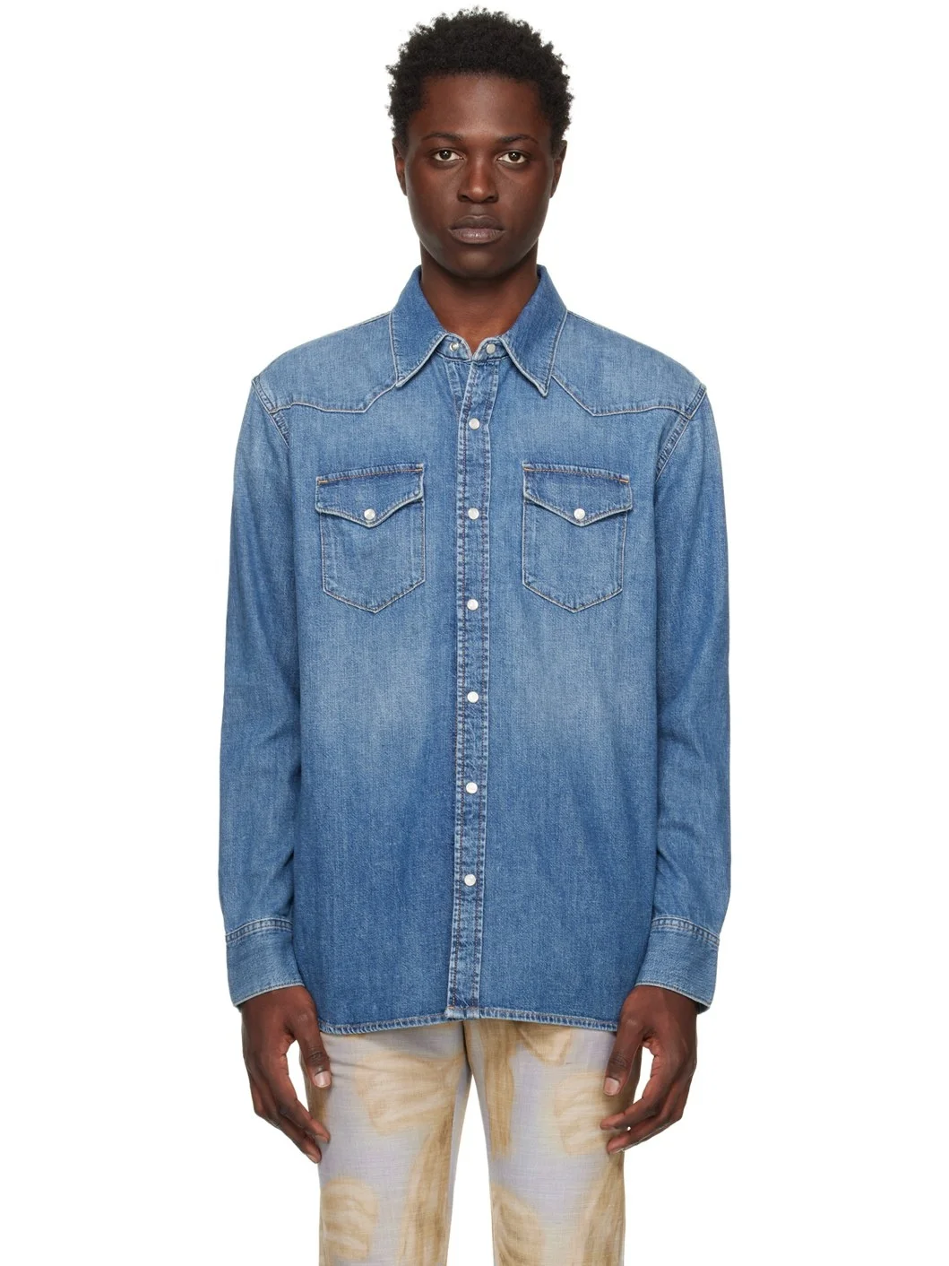 Non-stretch organic cotton denim shirt. Fading throughout. · Spread collar · Press-stud closure · Flap pockets · Shirttail hem · Logo flag at side seam · Press-stud barrel cuffs Supplier color: Mid blue