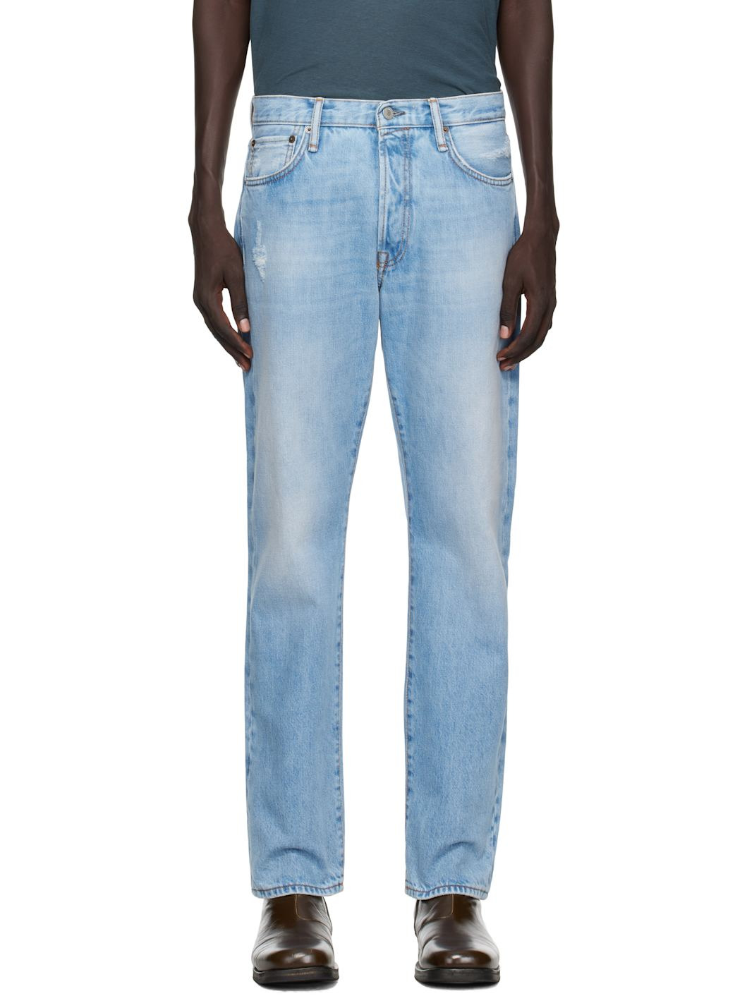Non-stretch organic cotton denim jeans. · Fading, whiskering, and distressing throughout · Straight-leg · Mid-rise · Belt loops · Five-pocket styling · Button fly · Leather logo patch at back waistband · Logo-engraved silver- and bronze-tone hardware · Contrast stitching in tan Supplier color: Light blue Body: 100% cotton. Trim: 100% leather. Made in Italy 252129M186001