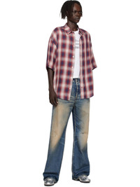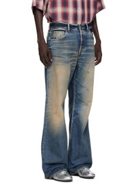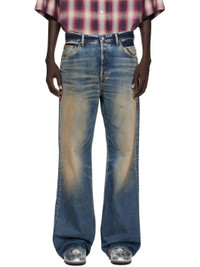 Non-stretch organic cotton denim jeans. · Discoloration, whiskering, and subtle distressing throughout · Flared, wide-leg · Mid-rise · Belt loops · Five-pocket styling · Button fly · Leather logo patch at back waistband · Logo-engraved silver-tone hardware · Contrast stitching in tan Supplier color: Dark blue Body: 100% cotton. Trim: 100% leather. Made in Italy 252129M186009