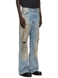 Garment-dyed non-stretch organic cotton denim jeans. · Fading, whiskering, distressing, and smudging throughout · Straight-leg · Mid-rise · Belt loops · Five-pocket styling · Button fly · Rip at knees · Leather logo patch at back waistband · Logo-engraved copper- and silver-tone hardware · Contrast stitching in tan Supplier color: Mid Blue 100% cotton. Made in Italy 252129M186008