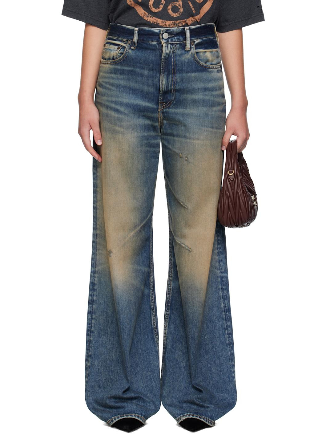 Non-stretch organic cotton denim jeans. · Distressing, whiskering, and discoloration throughout · Wide-leg · High-rise · Belt loops · Five-pocket styling · Button fly · Leather logo patch at back waistband · Contrast stitching in tan Supplier color: Dark blue 100% organic cotton. Made in Italy 252129F069006