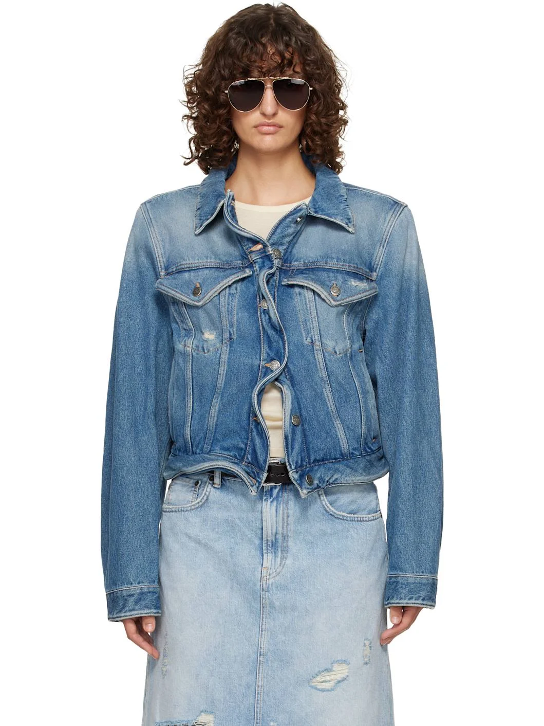 Non-stretch denim jacket. · Integrated wire at collar, pockets, hem, and cuffs · Fading and distressing throughout · Spread collar · Button closure · Flap pockets at chest · Welt pockets at waist · Buttoned barrel cuffs · Adjustable button tabs at back hem · Logo-engraved antiqued silver-tone hardware · Contrast stitching in tan Supplier color: Mid Blue 100% cotton. Made in Italy 261129F060014
