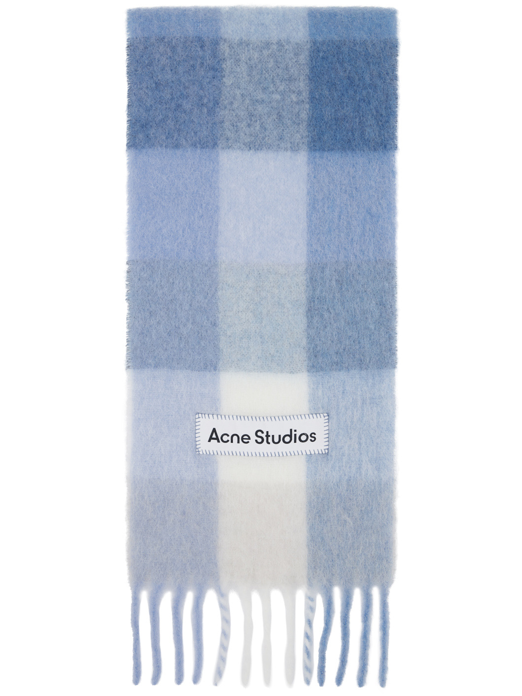 Rectangular brushed alpaca-blend flannel scarf. · Check pattern throughout · Logo patch at face · Fringed detailing at ends · L98.5" x W11" Supplier color: Light blue/White/Powder blue 33% alpaca, 25% wool, 22% nylon, 20% mohair. Made in Italy 252129F028046