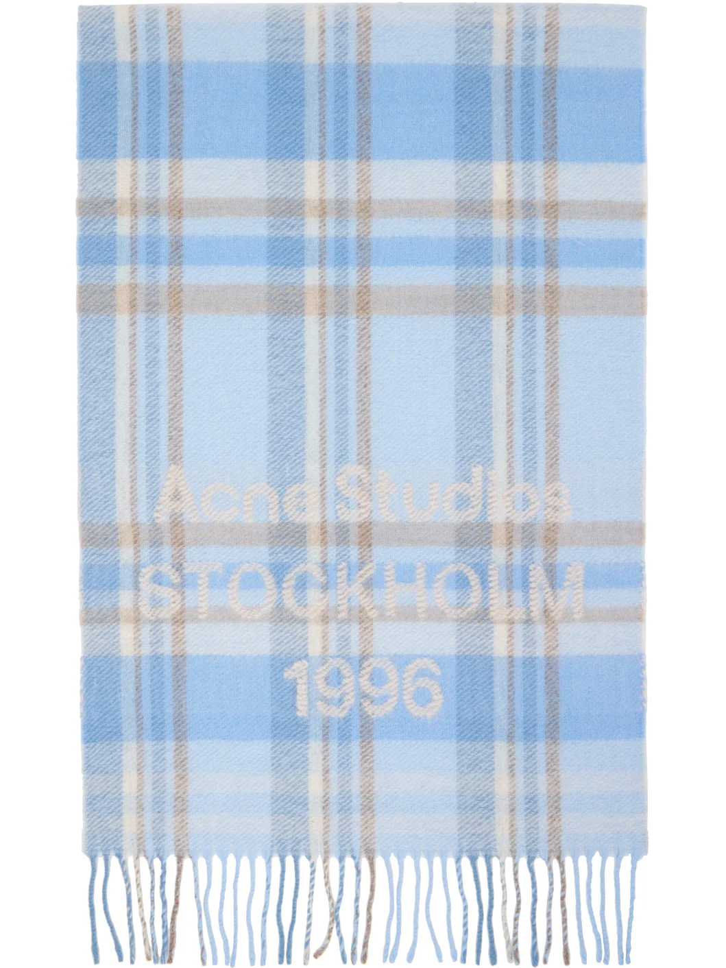 Rectangular wool-blend flannel scarf. · Check pattern throughout · Jacquard logo at face · Fringed detailing at ends · L78.75" x W15.75" Supplier color: Aqua blue/Beige 98% wool, 2% nylon. Made in Italy 252129F028012