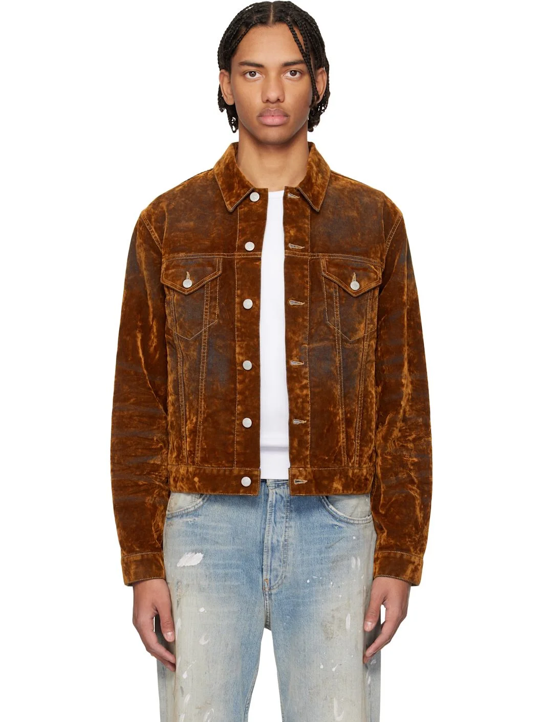 Flocked non-stretch cotton-blend denim jacket. · Spread collar · Button closure · Flap pockets at chest · Welt pockets at waist · Buttoned barrel cuffs · Adjustable button tabs at back hem · Logo-engraved silver-tone hardware Supplier color: Rust Brown 60% cotton, 20% polyester, 20% viscose. Made in Italy 261129M177000