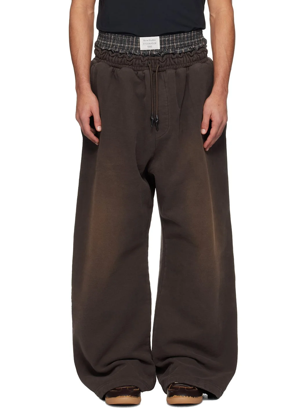 Organic cotton French terry sweatpants. · Fading throughout · Wide-leg · Check pattern and logo patch at layered elasticized waistband · Drawstring at elasticized waistband · Two-pocket styling · Mock fly · Bungee-style drawstring at cuffs · Logo applique and printed text at back Supplier color: Dark brown 100% cotton. Made in Portugal 252129M190006