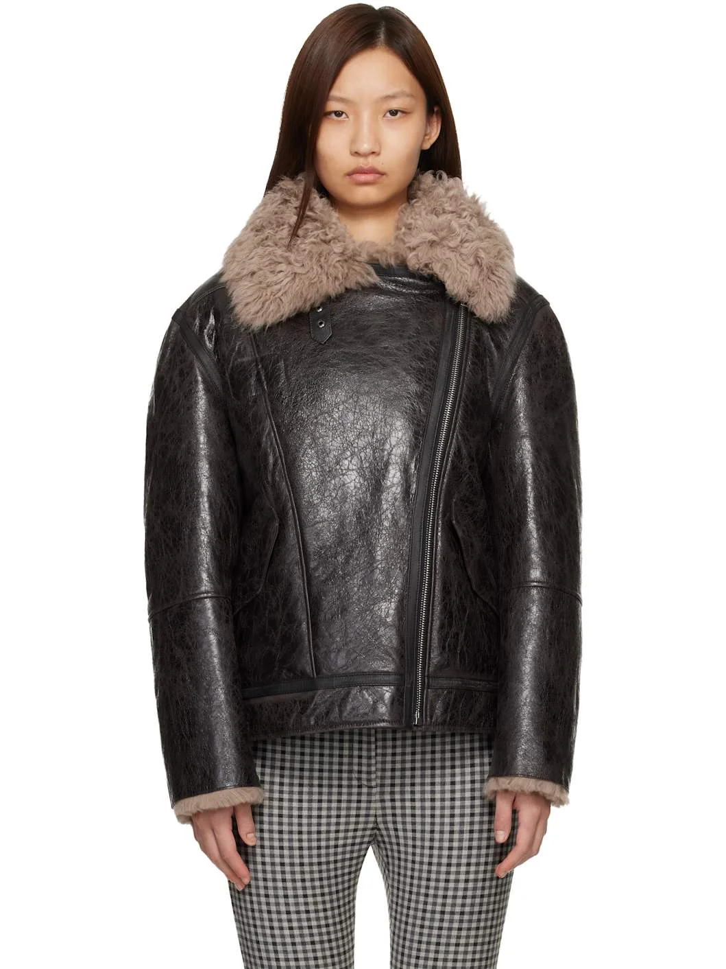 Grained lambskin jacket. · Pin-buckle tab at shearling spread collar · Offset zip closure · Flap pockets at waist · Dropped shoulders · Logo plaque at back collar · Pin-buckle tabs at back hem · Full shearling interior Supplier color: Dark grey 100% lambskin. Made in Turkey 261129F062000