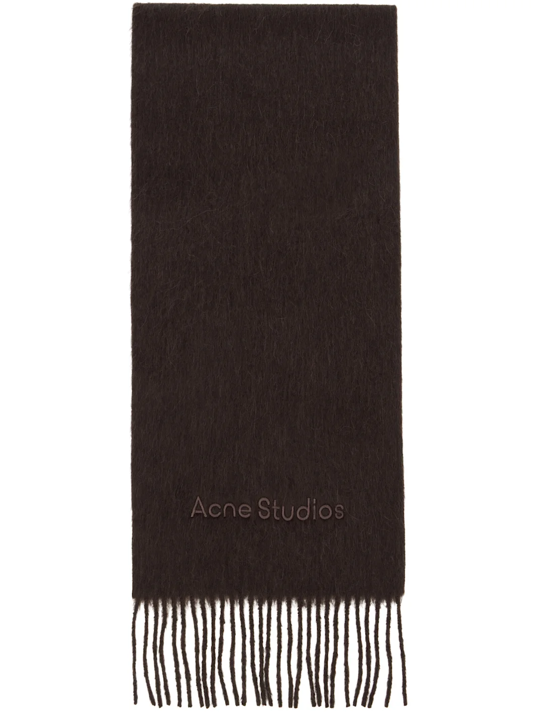 Rectangular brushed alpaca- and wool-blend flannel scarf. · Logo embroidered at face · Fringed detailing at ends · L67" x W10.5" Supplier color: Dark Brown Melange 73% alpaca, 27% wool. Made in Italy 261129F028048