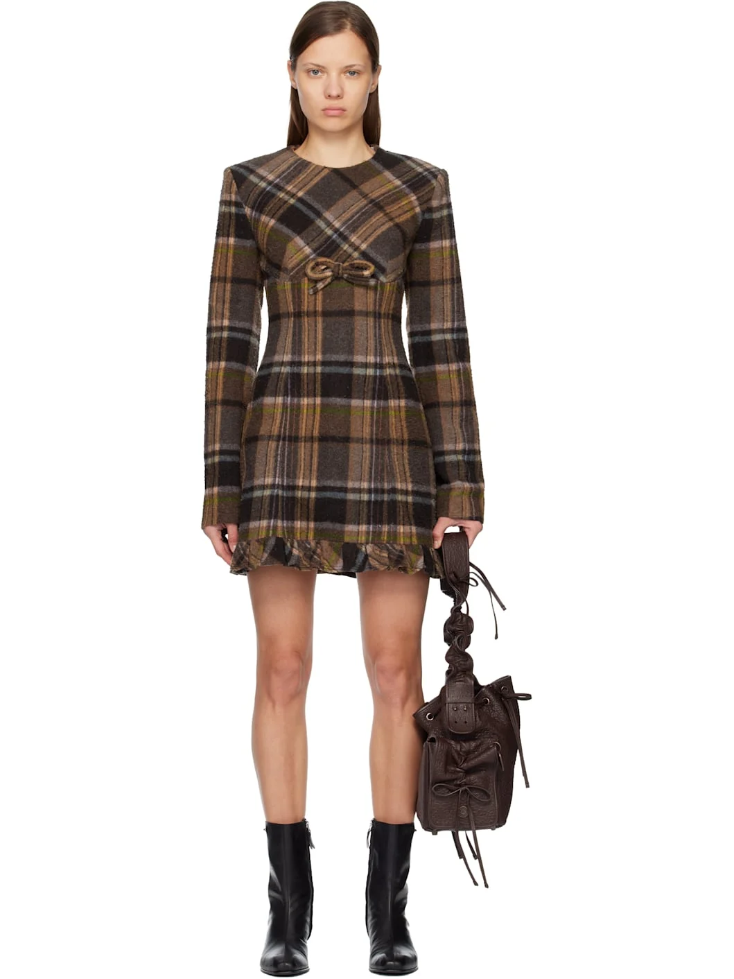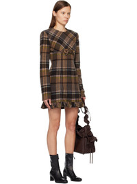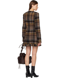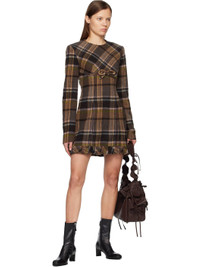 Brushed wool melton minidress. · Check pattern throughout · Round neck · Bow applique at chest · Ruffles at hem · Concealed zip closure at back · Full satin lining Supplier color: Multi brown 70% wool, 25% nylon, 5% other fibers. Lining: 67% acetate, 33% polyester. Made in Portugal 252129F052009