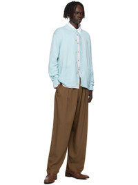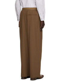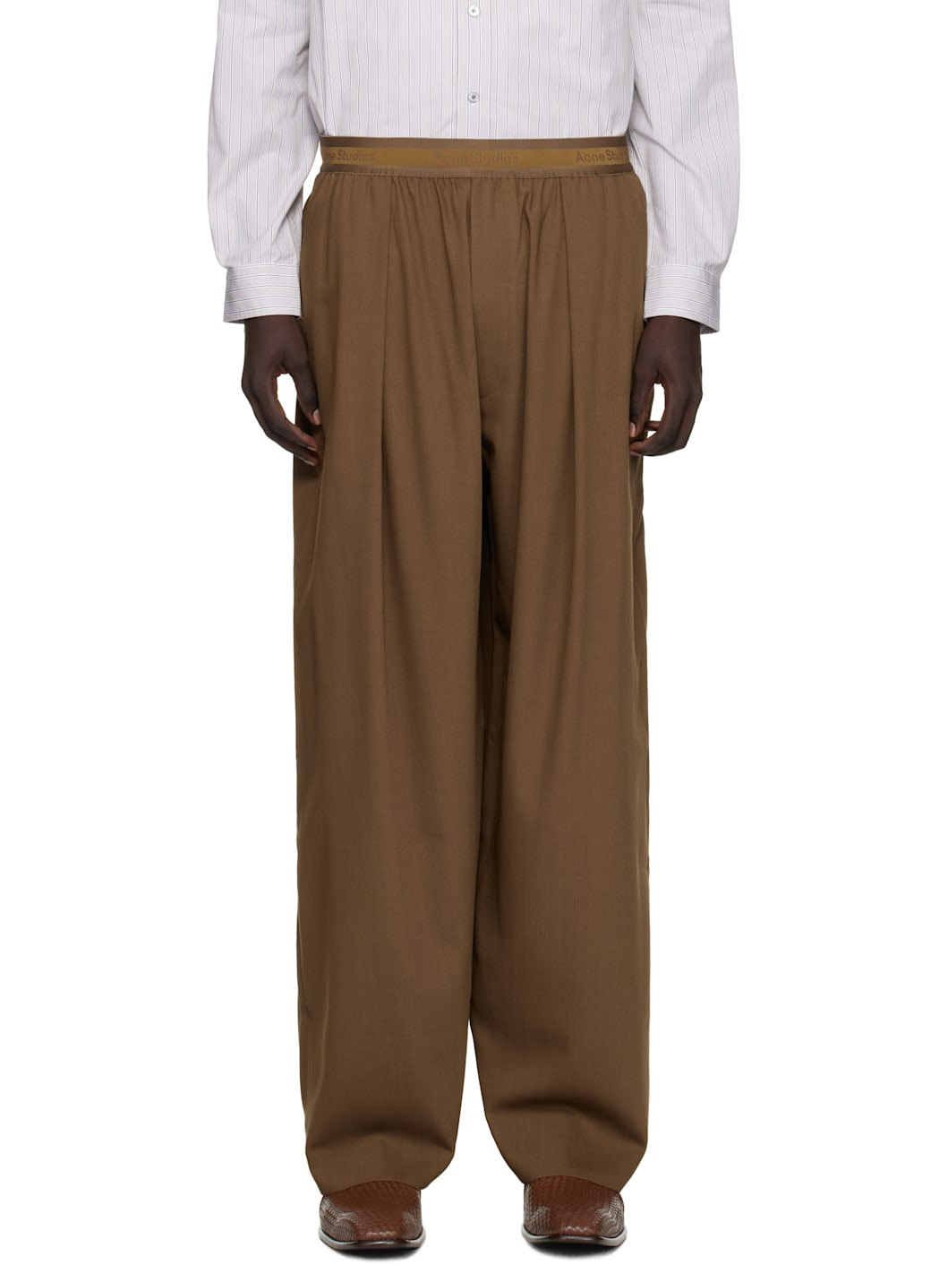 Viscose- and wool-blend gabardine trousers. · Loose-fit · Gathering at logo-woven elasticized waistband · Three-pocket styling · Mock fly · Pleats at waist Supplier color: Brown 65% viscose, 35% wool. Made in Bulgaria 252129M191002