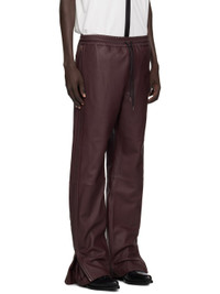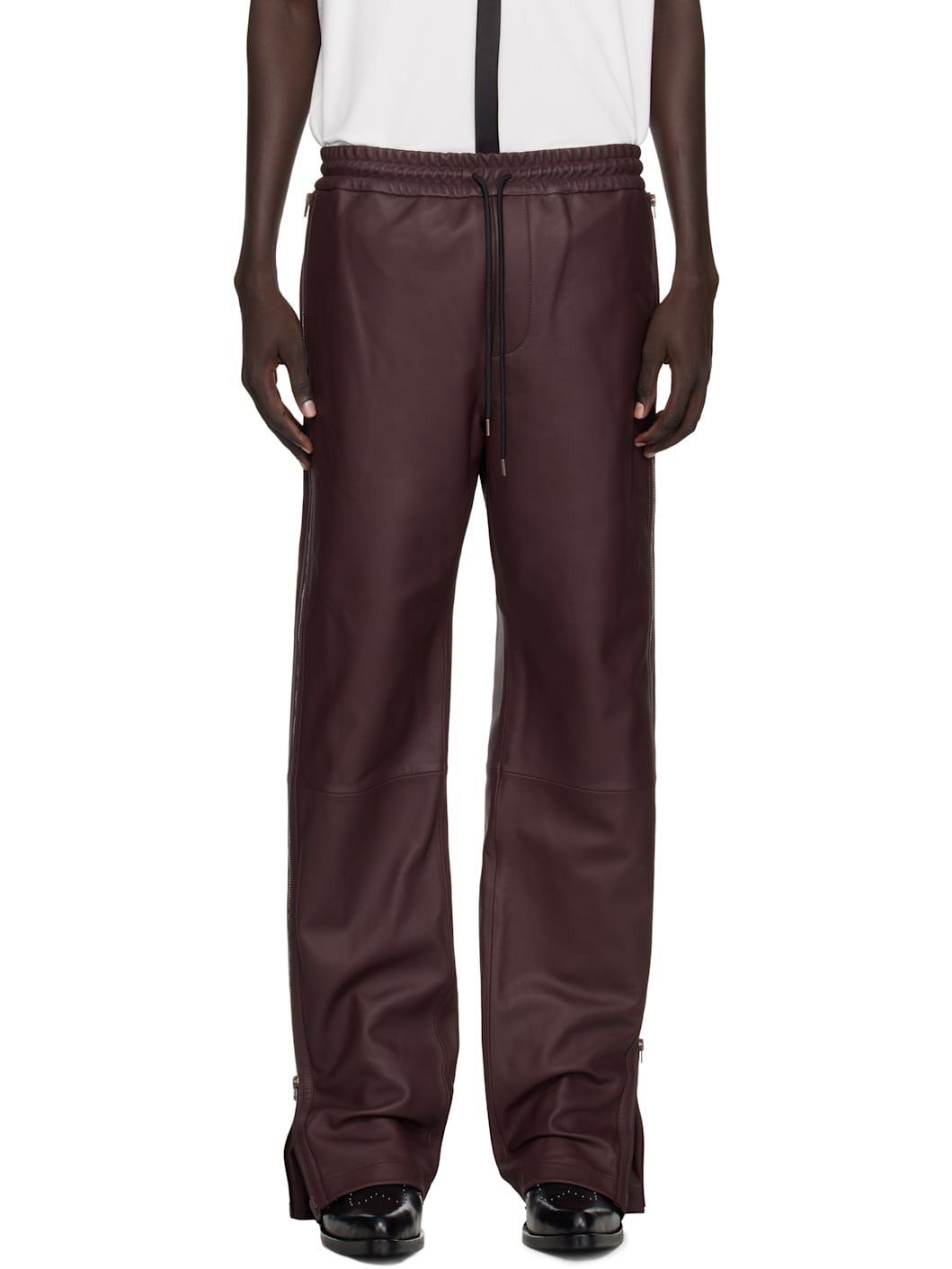Buffed lambskin pants. · LWG-certified lambskin · Straight-leg · Drawstring at elasticized waistband · Four-pocket styling · Mock fly · Two-way zip expansion panel at legs · Logo embossed at back pocket · Partial logo-woven satin lining · Logo-engraved antiqued copper-tone hardware Supplier color: Burgundy Body: 100% lambskin. Lining: 50% viscose, 50% acetate. Made in Turkey 252129M189001