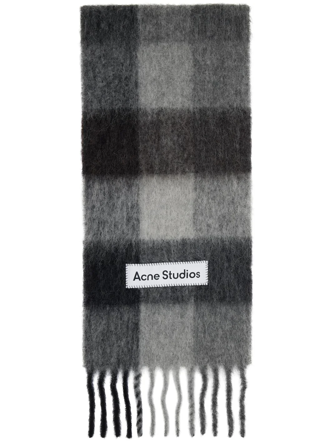 Rectangular brushed alpaca- and mohair-blend flannel scarf. · Check pattern throughout · Logo patch at face · Fringed detailing at ends · L98.5" x W11" Supplier color: Dark black/Grey/Dark grey 33% alpaca, 25% wool, 22% nylon, 20% mohair. Made in Italy 252129F028043