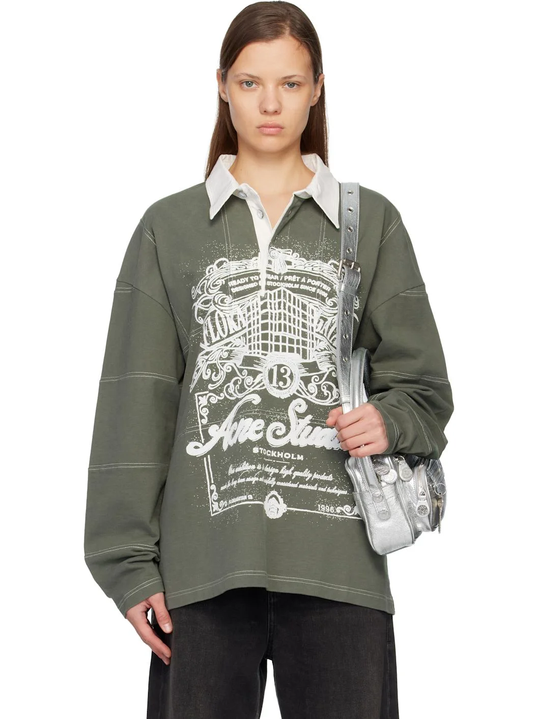 Cotton jersey polo. · Paneled construction · Twill spread collar · Two-button placket · Graphic, logo, and text printed at front · Tennis-tail hem · Dropped shoulders · Logo embroidered at back · Contrast stitching in white Supplier color: Vintage green 100% cotton. Made in Portugal 252129F108000