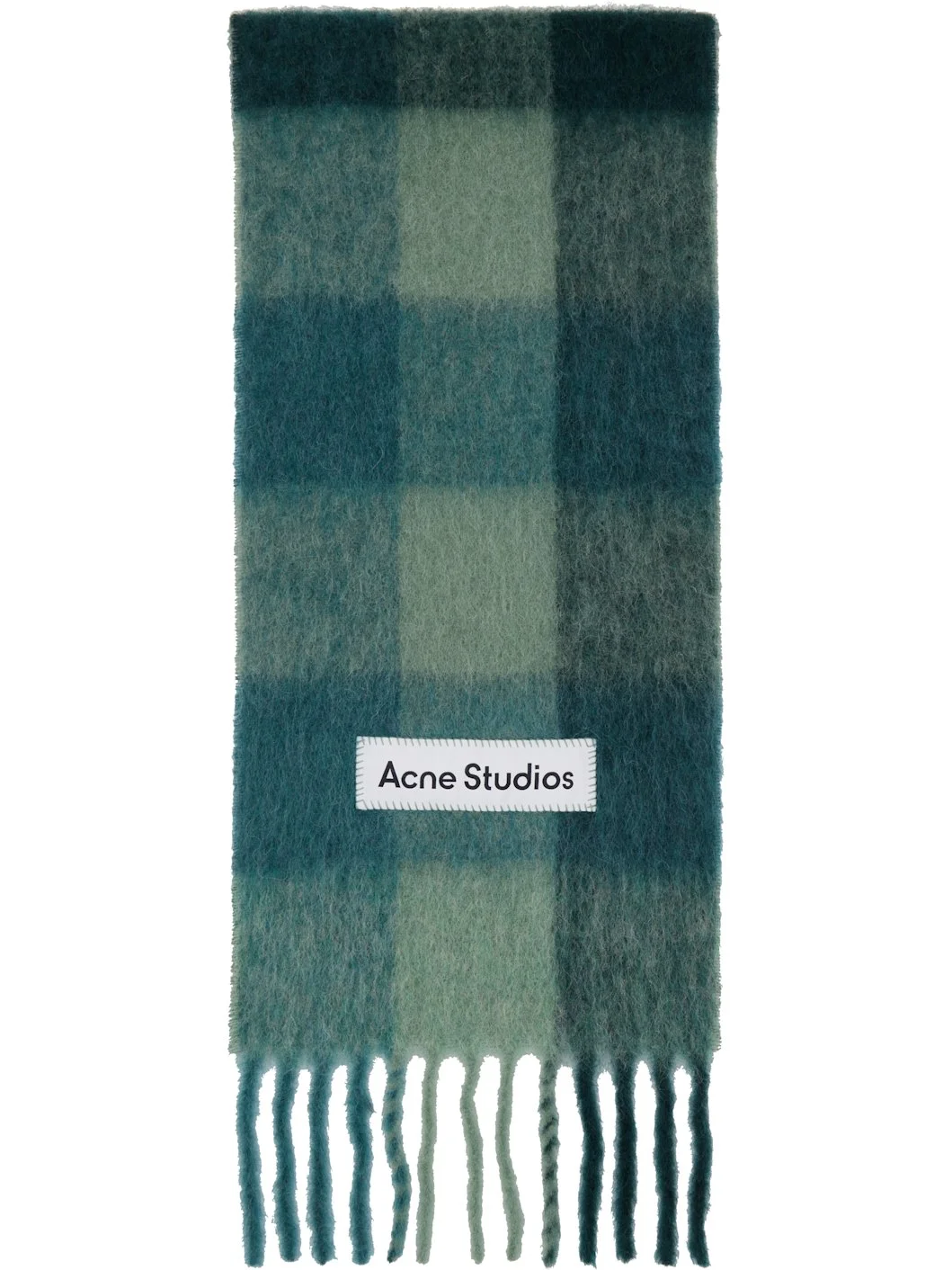 Rectangular brushed alpaca- and mohair-blend flannel scarf. · Check pattern throughout · Logo patch at face · Fringed detailing at ends · L98.5" x W11" Supplier color: Teal/Grey/Green 33% alpaca, 25% wool, 22% nylon, 20% mohair. Made in Italy 252129F028038