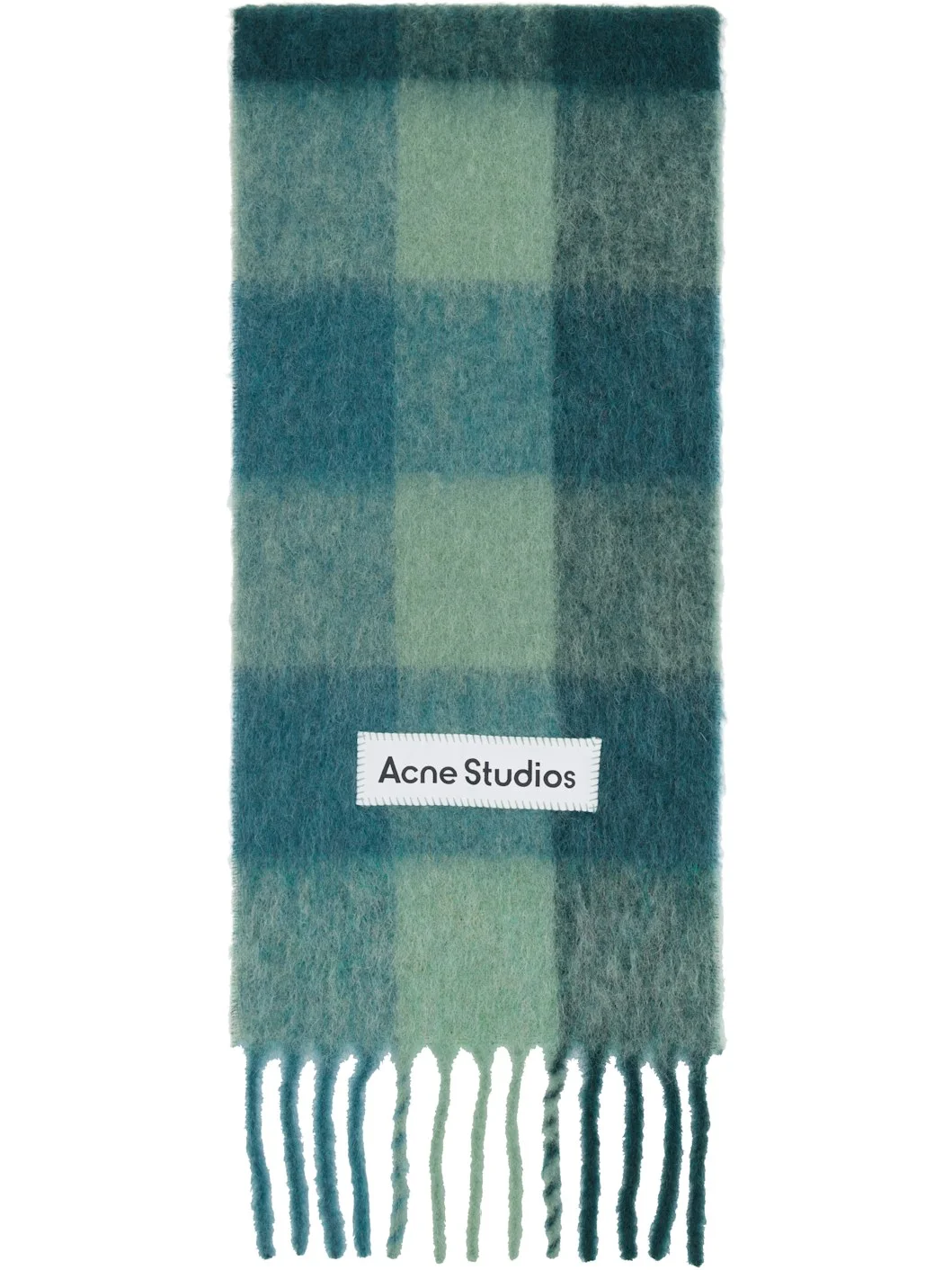 Rectangular brushed alpaca- and mohair-blend flannel scarf. · Check pattern throughout · Logo patch at face · Fringed detailing at ends · L98.5" x W11" Supplier color: Teal/Grey/Green 33% alpaca, 25% wool, 22% nylon, 20% mohair. Made in Italy 252129M150023
