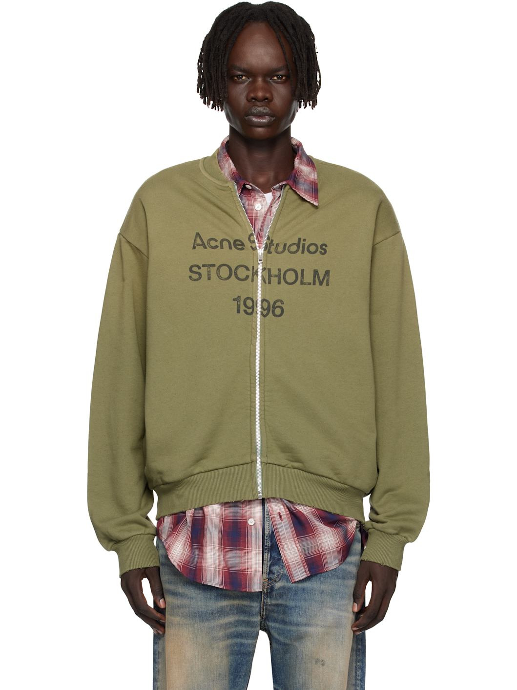 Cotton-blend French terry cardigan. · Discoloration and subtle distressing throughout · Rib-knit stand collar, hem, and cuffs · Zip closure · Logo and text printed at front · Seam pockets at waist · Dropped shoulders · Logo-engraved antiqued silver-tone hardware Supplier color: Olive green 89% cotton, 11% polyester. Made in Portugal 252129M202015