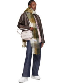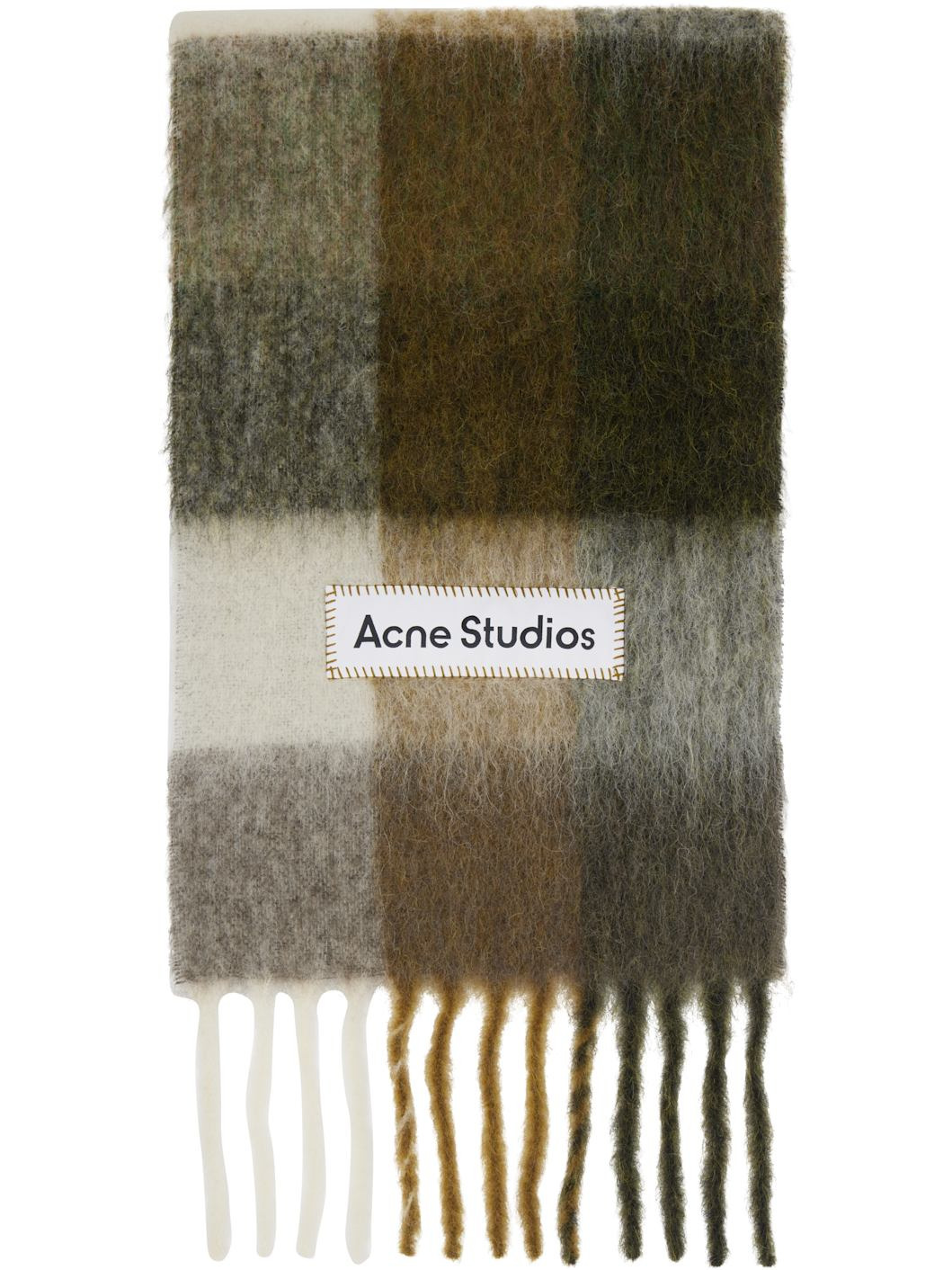 Rectangular brushed alpaca- and wool-blend flannel scarf. · Jacquard check pattern throughout · Logo patch at face · Fringed detailing at ends · L98" x W11" Supplier color: Taupe/Green/Black 33% alpaca, 25% wool, 22% nylon, 20% mohair. Made in Italy 252129F028048