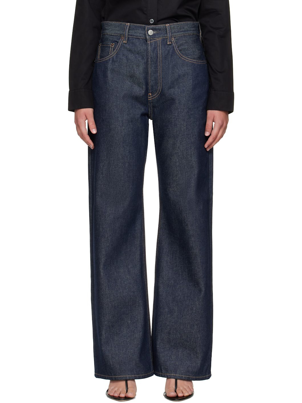 Non-stretch organic cotton denim jeans. · Wide straight-leg · Mid-rise · Belt loops · Five-pocket styling · Button fly · Logo patch at back waistband · Contrast stitching in tan Supplier color: Indigo blue 100% organic cotton. Made in Italy 252129F069037