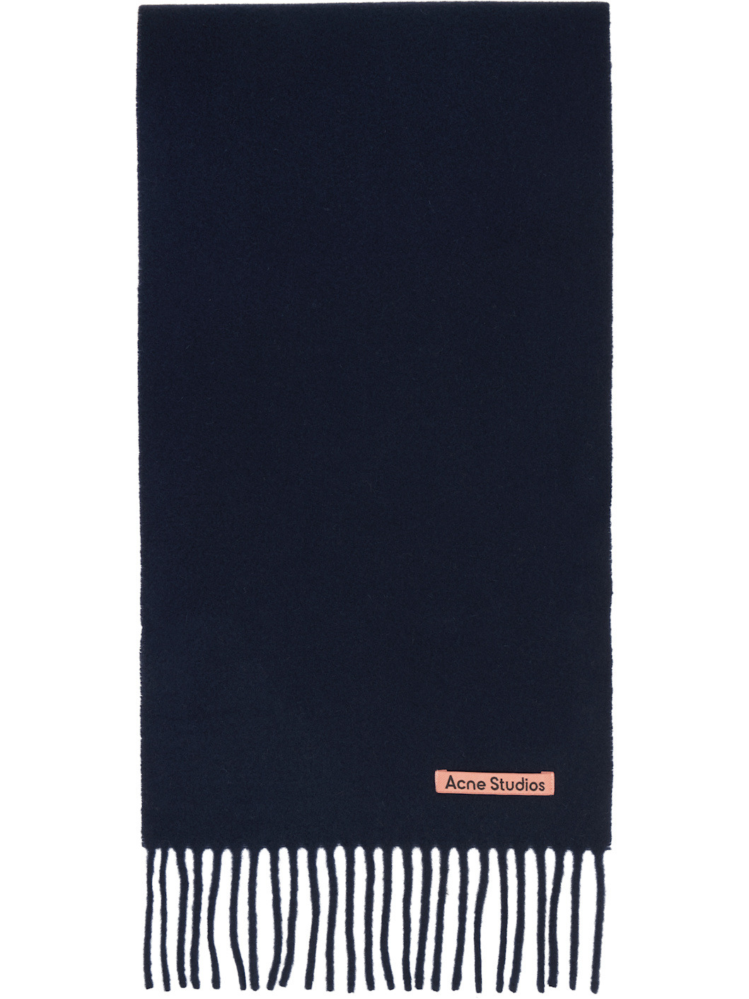 Rectangular RWS-certified wool flannel scarf. · Logo patch at face · Fringed detailing at ends · L74" x W11" Supplier color: Navy blue 100% wool. Made in Italy 252129F028028