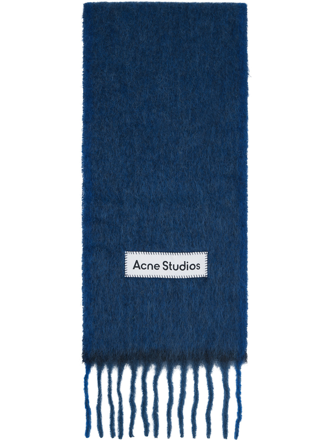 Rectangular brushed alpaca- and wool-blend felt scarf. · Logo patch at face · Fringed detailing at striped ends · L98.5" x W11" Supplier color: Dark navy/Black 33% alpaca, 25% wool, 22% nylon, 20% mohair. Made in Italy 252129F028023