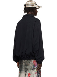 Stretch viscose-blend twill jacket. · Pinstripes throughout · Stand collar · Two-way zip closure · Logo graphic embroidered at chest · Welt pockets at waist · Elasticized hem and cuffs · Dropped shoulders · Locker loop at inner collar · Full logo-woven satin lining · Logo-engraved antiqued silver-tone hardware Supplier color: Navy Body: 97% viscose, 2% elastane, 1% polyester. Lining: 50% viscose, 50% acetate. Made in Bulgaria 252129M180022