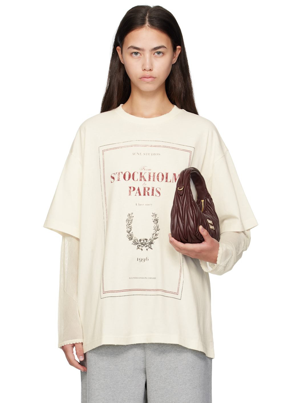 Relaxed-fit organic cotton jersey T-shirt. · Subtle distressing at rib-knit crewneck, hem, and cuffs · Graphic and text printed at front · Layered sheer mesh sleeves · Dropped shoulders Supplier color: Off White Body 1: 100% cotton. Body 2: 100% nylon. Made in Portugal 252129F110060