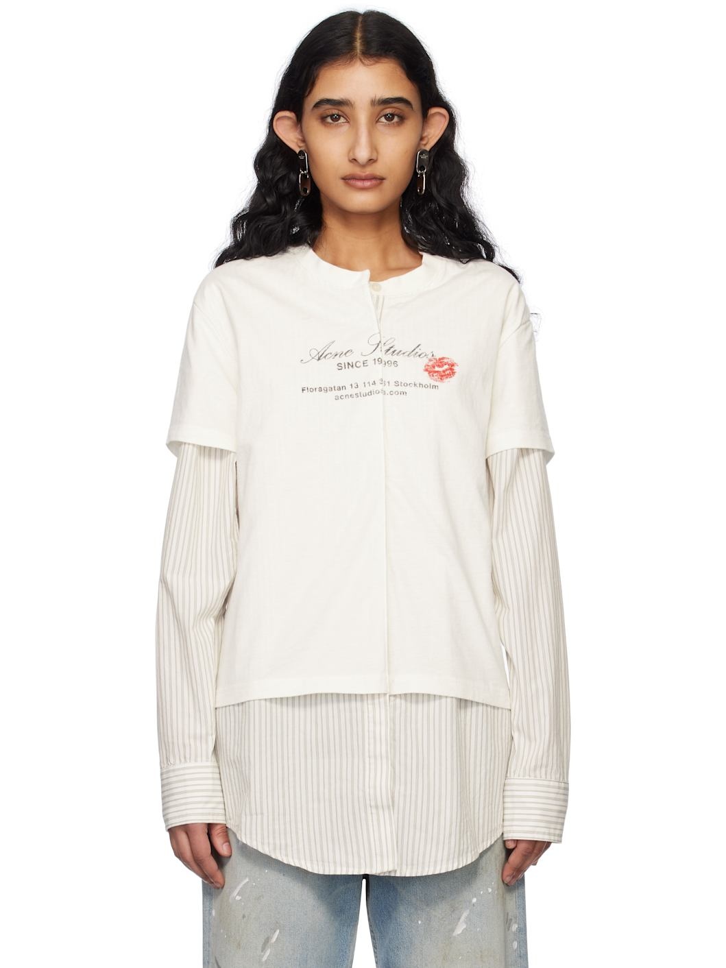 Organic cotton jersey and cotton poplin T-shirt. Stripes at shirt-style underlay. · Layered construction · Rib-knit crewneck · Concealed button closure · Logo graphic and text printed at chest · Shirttail hem · Pleated single-button barrel cuffs · Box pleat at back yoke Supplier color: Off white Body 1: 100% organic cotton. Body 2: 100% cotton. Made in Portugal 251129F109009