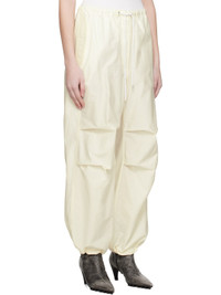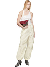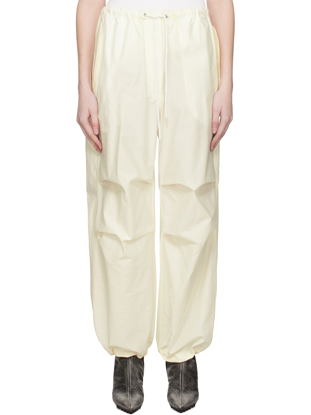 Crinkled organic cotton-blend poplin trousers. · Relaxed-fit and wide-leg · Mid-rise · Drawstring at elasticized waistband · Three-pocket styling · Zip-fly · Tucks at knees · Concealed drawstring at cuffs · Logo embroidered at back pocket Supplier color: White Body: 85% organic cotton, 15% nylon. Trim: 100% cotton. Made in Lithuania 251129F087003