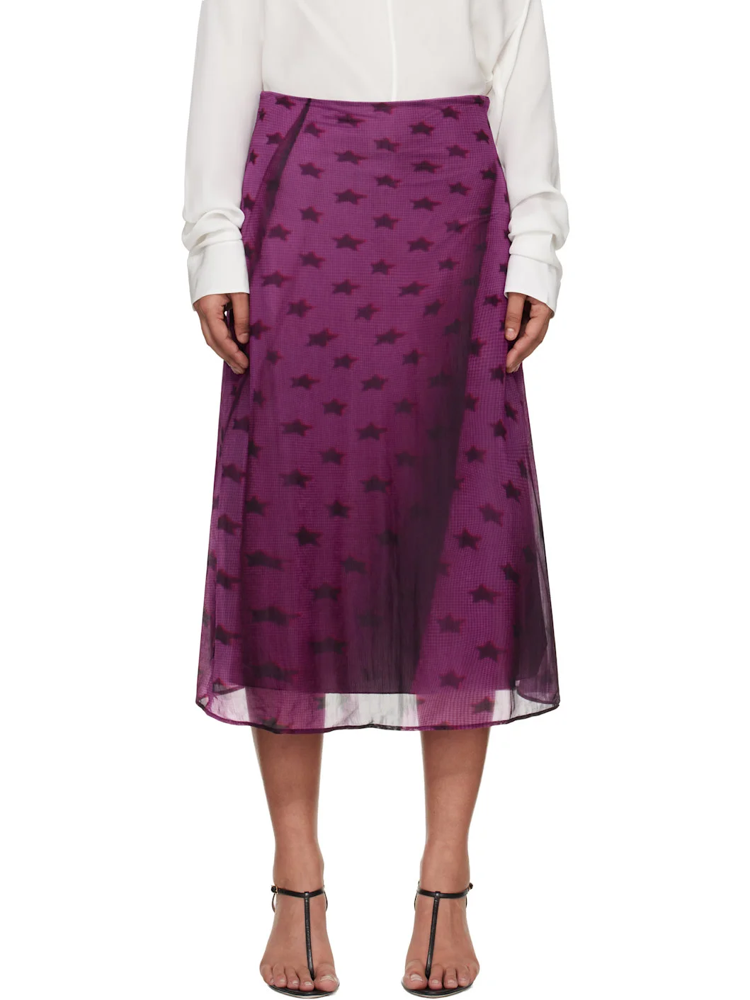 Semi-sheer nylon mesh maxi skirt. · Graphic pattern printed throughout · Zip closure at side seam · Full jersey lining Supplier color: Bright purple Body: 100% nylon. Lining: 80% nylon, 20% elastane. Made in Portugal 252129F093001