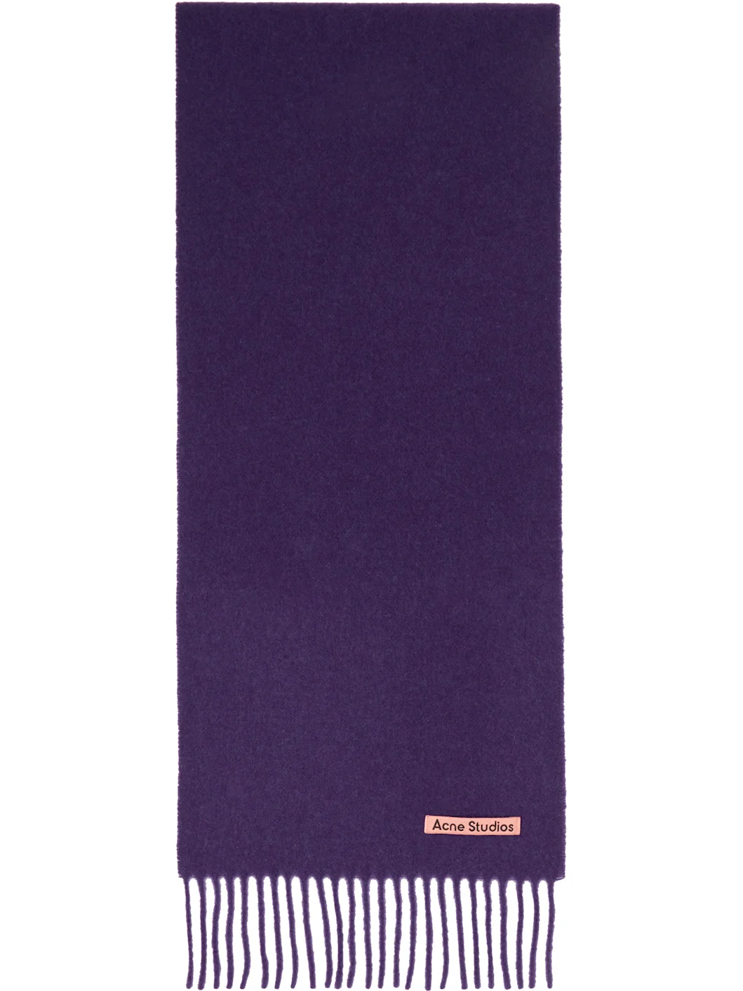 Rectangular RWS-certified wool flannel scarf. · Logo patch at face · Fringed detailing at ends · L74" x W11" Supplier color: Violet purple me 100% wool. Made in Italy 261129M150035