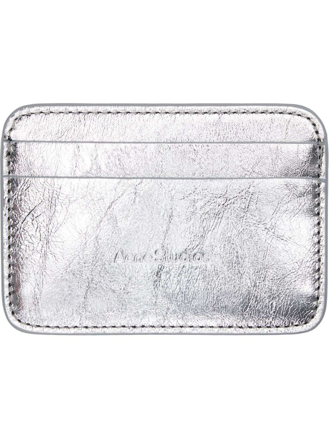 Crinkled leather card holder. · Logo embossed at face · Four card slots · Central note slot · H3" x W4" Supplier color: Silver Leather. Made in Italy 252129M163013