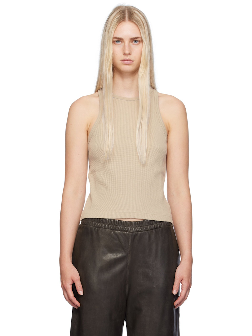 Garment-dyed waffle knit organic cotton tank top. · Rib knit crewneck and armscyes · Rubberized logo patch at back Supplier color: Bright grey 100% organic cotton. Made in Portugal 242129F110015