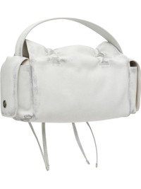 Grained calfskin top handle bag. · Fading throughout · Logo embossed at adjustable shoulder strap · Logo charm and drawstrings at face · Flap pocket at sides · Magnetic flap · Patch pocket at interior · Buffed faux-leather lining · H8" x W13.5" x D4" Supplier color: White/Grey Calfskin. Made in Italy 252129F046001