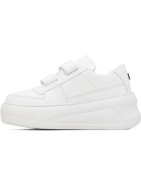 Low-top buffed leather sneakers. · LWG-certified leather · Perforations at toe · Logo embossed at vamp · Velcro closure · Padded tongue and collar · Logo hardware at heel tab · Mesh lining · Logo embossed at rubber platform midsole · Treaded rubber sole · Platform: H2.75" Supplier color: Optic white/Optic white Upper: leather. Sole: rubber. Made in Italy 252129M237004