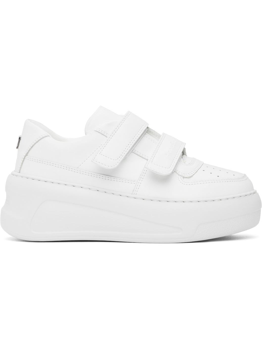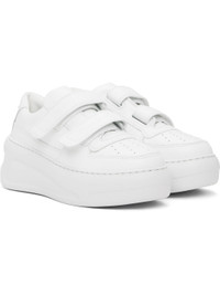 Low-top buffed leather sneakers in white. · Perforations at toe · Velcro closure · Logo embossed at strap and heel counter · Padded tongue and collar · Logo hardware at heel tab · Mesh lining · Foam rubber platform sole · Platform: H1.75" · Heel: H2.5" Supplier color: Optic white/Optic white Upper: leather. Sole: rubber. Made in Italy 251129F128003
