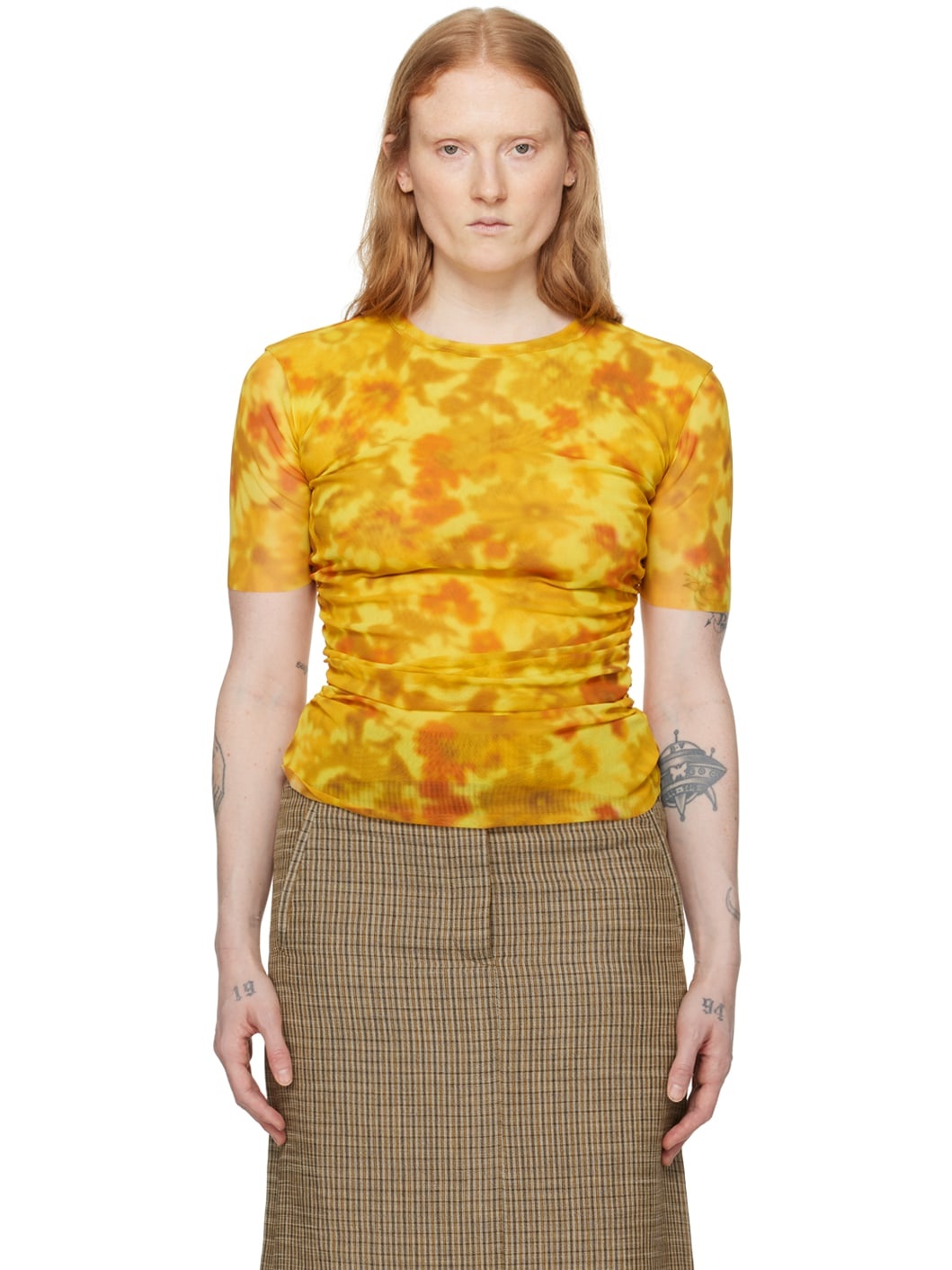 Nylon mesh T-shirt. · Ruching and graphic printed throughout. · Rib knit crewneck Supplier color: Yellow multi 100% nylon. Made in Portugal 241129F110073