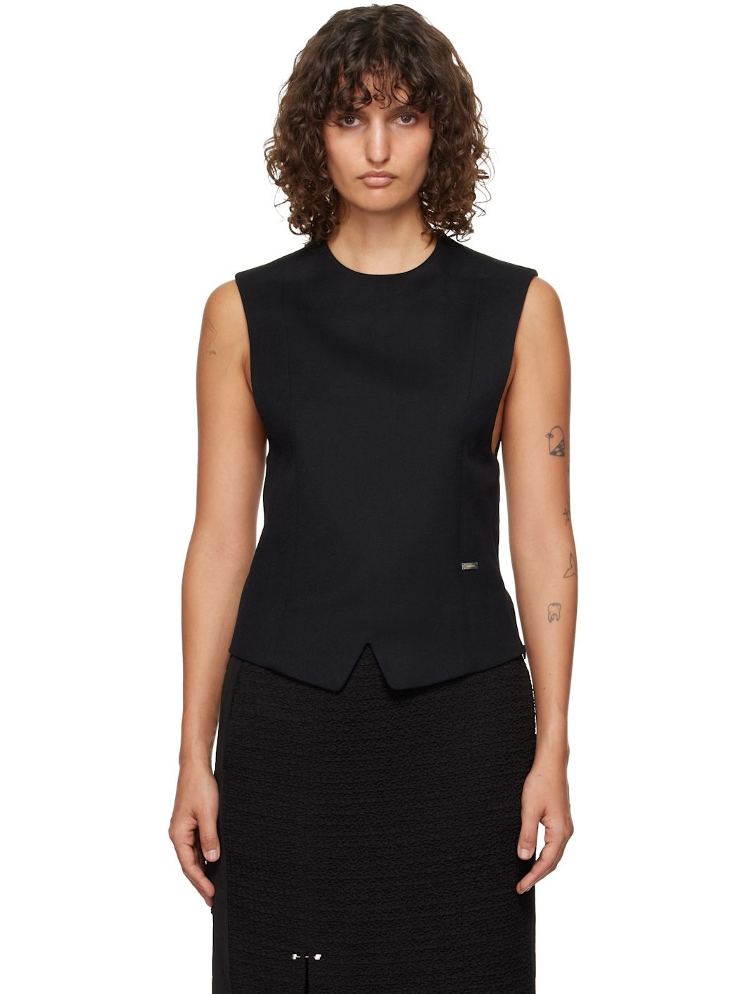 Wool serge top. · Round neck · Hand-stitched logo plaque at front · Notch at front hem · Concealed zip closure at side seam and shoulder · Fixed hardware and logo flag at back · Cinch strap at back · Full logo-woven satin lining Supplier color: Noir Body: 100% wool. Lining: 55% polyester, 45% viscose. Made in South Korea 242039F111001