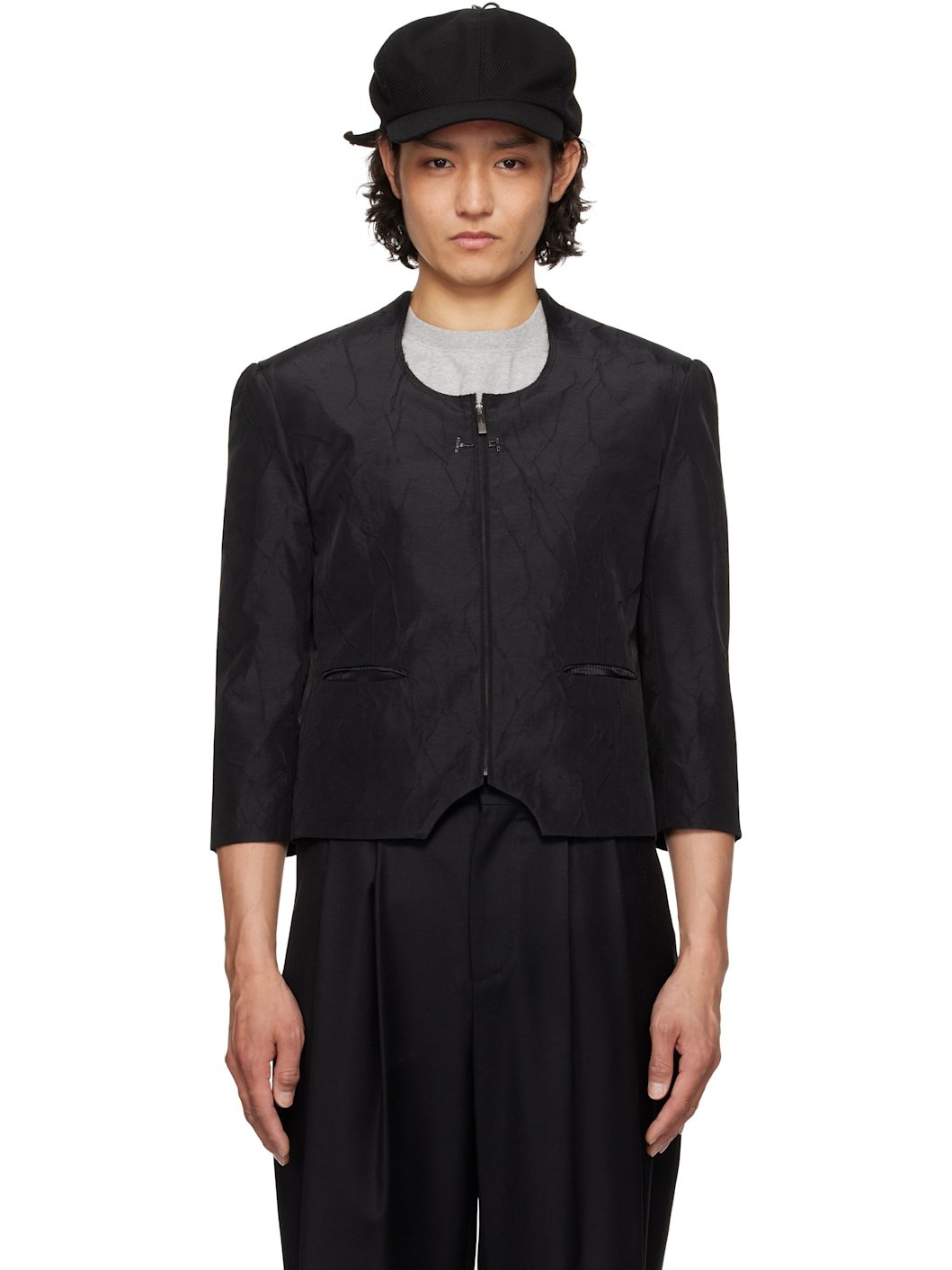 Slim-fit crinkled plain-woven nylon-blend blazer. · Raw edge at modified scoop neck · Zip closure · Hook-eye fastening at chest · Darts at front and back · Welt pockets · Cutout at front hem · Gathering at padded shoulders · Frayed flag with topstitching at back · Welt pocket at interior · Full satin lining Supplier color: Noir Body: 55% nylon, 45% polyester. Lining: 55% polyester, 45% rayon. Made in South Korea 251039M195005
