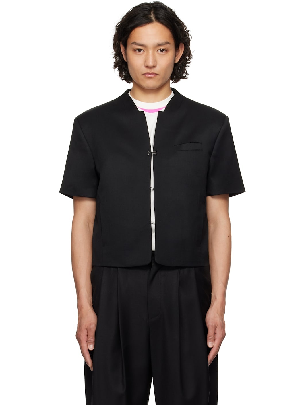 Wool twill overshirt. · Notched collar · Hook-eye closure · Ripped detailing at chest · Welt pockets · Padded shoulders · Frayed flag with topstitching at back · Welt pocket at interior · Full logo-woven satin lining Supplier color: Black Body: 100% wool. Lining: 55% polyester, 45% rayon. Made in South Korea 251039M192025