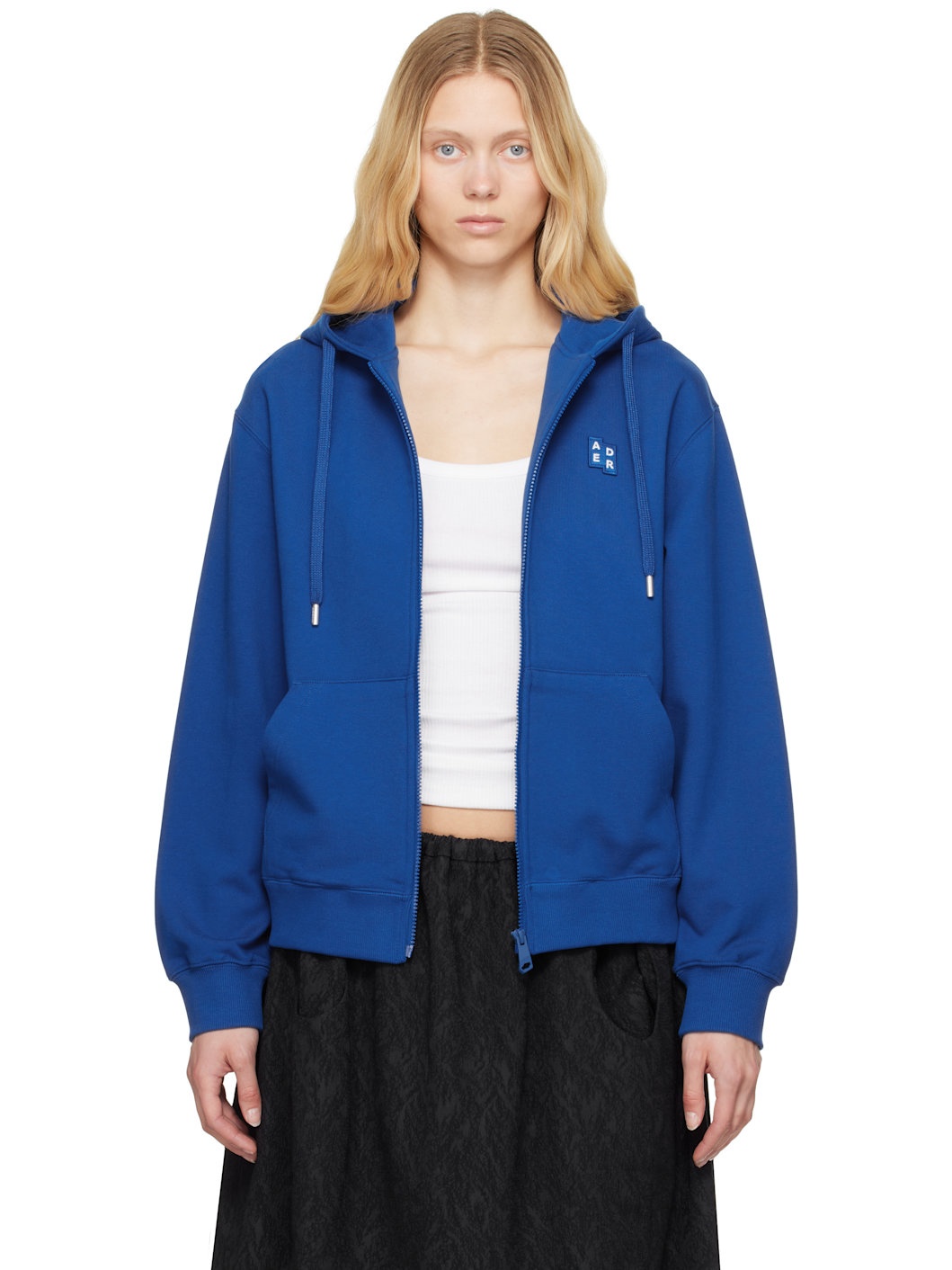 French terry hoodie. · Drawstring at hood · Zip closure · Embroidered logo patch at chest · Patch pockets · Rib-knit hem and cuffs · Dropped shoulders · Logo flag with topstitching at back · Logo-engraved silver-tone hardware Part of the Significant collection. Supplier color: Blue Body: 100% cotton. Trim: 96% cotton, 4% elastane. Made in South Korea 251039F097013