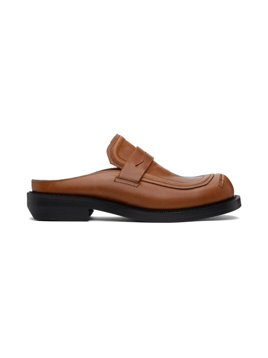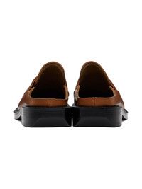 Buffed leather slip-on loafers in brown. · Fading throughout · Topstitching at moc square toe · Logo embossed at padded leather footbed · Buffed leather lining · Serrated detailing at welt · Leather block heel with rubber injection · Leather sole · Heel: H1.5" Supplier color: Brown Upper: leather. Sole: leather, rubber. Made in South Korea 241039F121001