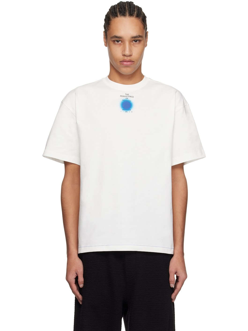 Cotton-blend jersey T-shirt. · Rib-knit crewneck · Logo, graphic, and text printed at chest · Contrast stitching in blue at hem · Dropped shoulders · Frayed logo flag with topstitching at back Supplier color: Off white Body: 73% cotton, 27% polyester. Trim: 96% cotton, 4% elastane. Made in South Korea 251039M213016