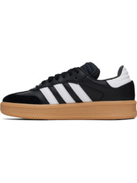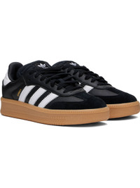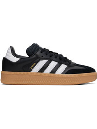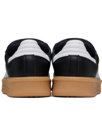 Low-top buffed leather sneakers in black and white. · Grained leather trim throughout · Suede trim at toe · Lace-up closure · Embroidered logo patch at padded tongue · Padded collar · Signature serrated stripes at sides · Text bonded at outer side · Buffed leather and mesh lining · Treaded rubber sole Supplier color: Core black/Cloud white/Gum Upper: leather. Sole: rubber. Made in Viet Nam 251751M237165