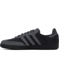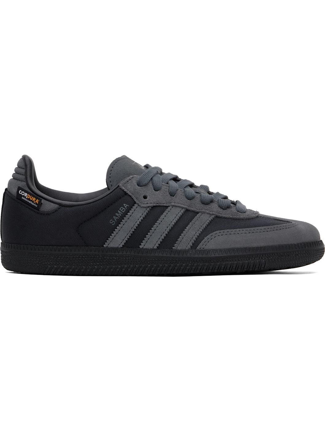 Low-top paneled suede and CORDURA® canvas sneakers in black and gray. · Lace-up closure · Logo bonded at tongue · Padded collar · Signature serrated stripes at sides · Text bonded at outer side · Logo flag at outer side · Buffed faux-leather and mesh lining · Treaded rubber sole Supplier color: Core black/Grey six/Core black Upper: leather, synthetic, textile. Sole: rubber. Made in Viet Nam 251751M237166