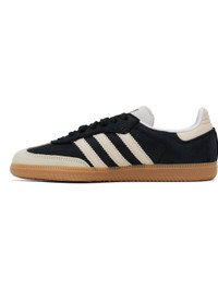 Low-top nubuck sneakers in black and beige. · Grained and buffed leather trim throughout · Lace-up closure · Logo printed at tongue · Padded collar · Signature serrated stripes at sides · Text embossed at outer side · Grained leather and mesh lining · Treaded rubber sole Supplier color: Core black/Wonder white/Silver metallic Upper: leather. Sole: rubber. Made in Viet Nam 251751F128217