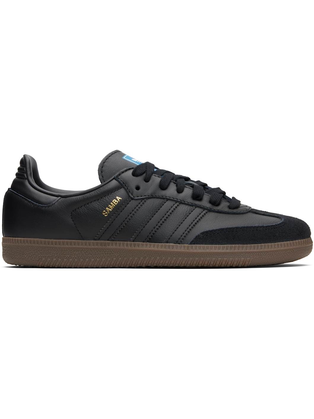 Low-top buffed leather sneakers. · Suede trim at toe · Lace-up closure · Logo printed at tongue · Padded collar · Text stamp at outer side · Signature serrated stripes at sides · Quilted heel tab · Mesh lining · Treaded rubber sole Supplier color: Core black/Core black/Gum Upper: leather. Sole: rubber. Made in Viet Nam 252751M237093